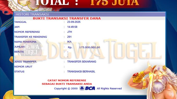 DEWATOGEL mengucapkan selamat kepada user id : IUY*** yang telah berhasil mendapatkan jackpot pada permainan SLOT DI LUCKY NEKO. Kemenangan sebesar Rp 175.000.000,-. telah dibayarkan LUNAS oleh pihak dewatogel kepada pemilik user id setelah yang bersangkutan mengisi formulir withdraw. Proses pencairan dana berlangsung sangat cepat hanya dalam waktu 5-10 menit sudah berada dalam rekening pemilik user id. Bukti transfer yang dapat anda lihat adalah bukti SAH / VALID yang langsung di dapatkan melalui bukti transaksi dari Bank yang digunakan untuk pengiriman dana pada rekening pemilik user id. Terima kasih kami sampaikan kepada para pengguna setia DEWATOGEL yang telah menggunakan situs kami, sebagai Bandar Terpercaya yang pastinya membayar semua kemenangan member hingga lunas. Apakah DEWATOGEL PENIPU ? Reputasi “DEWATOGEL TERPERCAYA” sudah sangat melekat. puluhan hingga ratusan ribu pengguna setia DEWATOGEL tetap menggunakan situs terbesar dan terbaik di Indonesia ini. Hapus rasa was-was dan khawatir anda, kemenangan anda berapapun PASTI dibayarkan hingga lunas.