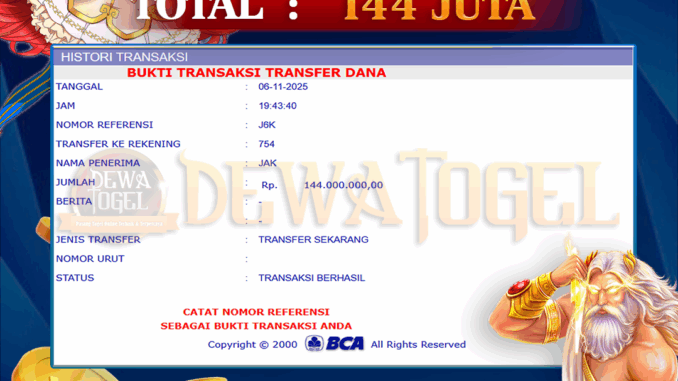 DEWATOGEL mengucapkan selamat kepada user id : MUJ*** yang telah berhasil mendapatkan jackpot pada permainan SLOT KOI GATES. Kemenangan sebesar Rp 144.000.000,- telah dibayarkan LUNAS oleh pihak dewatogel kepada pemilik user id setelah yang bersangkutan mengisi formulir withdraw. Proses pencairan dana berlangsung sangat cepat hanya dalam waktu 5-10 menit sudah berada dalam rekening pemilik user id. Bukti transfer yang dapat anda lihat adalah bukti SAH / VALID yang langsung di dapatkan melalui bukti transaksi dari Bank yang digunakan untuk pengiriman dana pada rekening pemilik user id. Terima kasih kami sampaikan kepada para pengguna setia DEWATOGEL yang telah menggunakan situs kami, sebagai Bandar Terpercaya yang pastinya membayar semua kemenangan member hingga lunas. Apakah DEWATOGEL PENIPU ? Reputasi “DEWATOGEL TERPERCAYA” sudah sangat melekat. puluhan hingga ratusan ribu pengguna setia DEWATOGEL tetap menggunakan situs terbesar dan terbaik di Indonesia ini. Hapus rasa was-was dan khawatir anda, kemenangan anda berapapun PASTI dibayarkan hingga lunas.